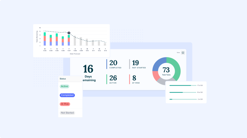 A collection of KPIs, a donut chart, and a line chart providing contract specialists insights into how their evaluations’ progress. Breaking down each evaluation into tasks, the dashboard not only provides updates on the status of each task, but also a forecast into how progress will continue in the future. Coded in Typescript D3 and MUI v5.