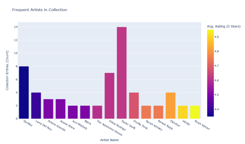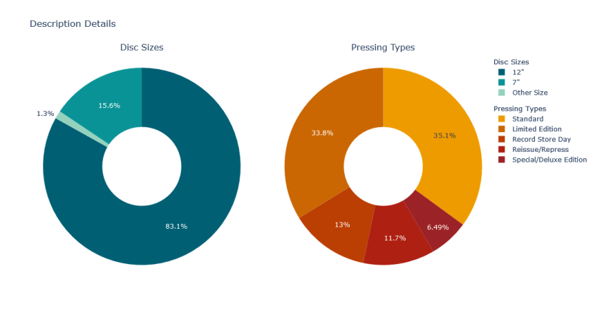 An analytics project showcasing data pulled from the Discogs API and visualizations related to my personal vinyl collection. Coded in Python using Pandas for dataframe creation and analysis and Plotly for visualizations.